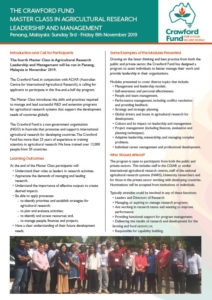 The fourth Master Class in Agricultural Research Leadership and Management, delivered by The Crawford Fund, in conjunction with ACIAR will be held in Penang, Malaysia from 3-8 November 2019.