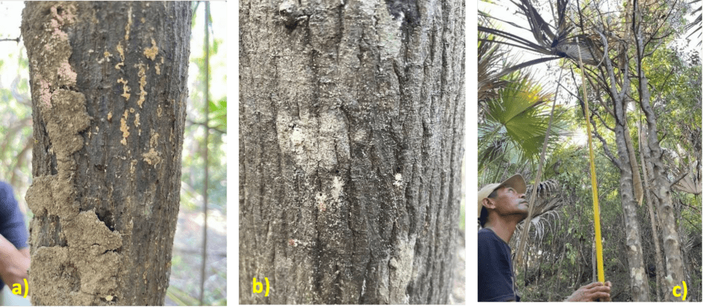 Observed pests and diseases present in sandalwood trees at Clacuc. Termites (a) and fungus (b). The tree had a dead top but was still alive, determined by physical inspection (c).