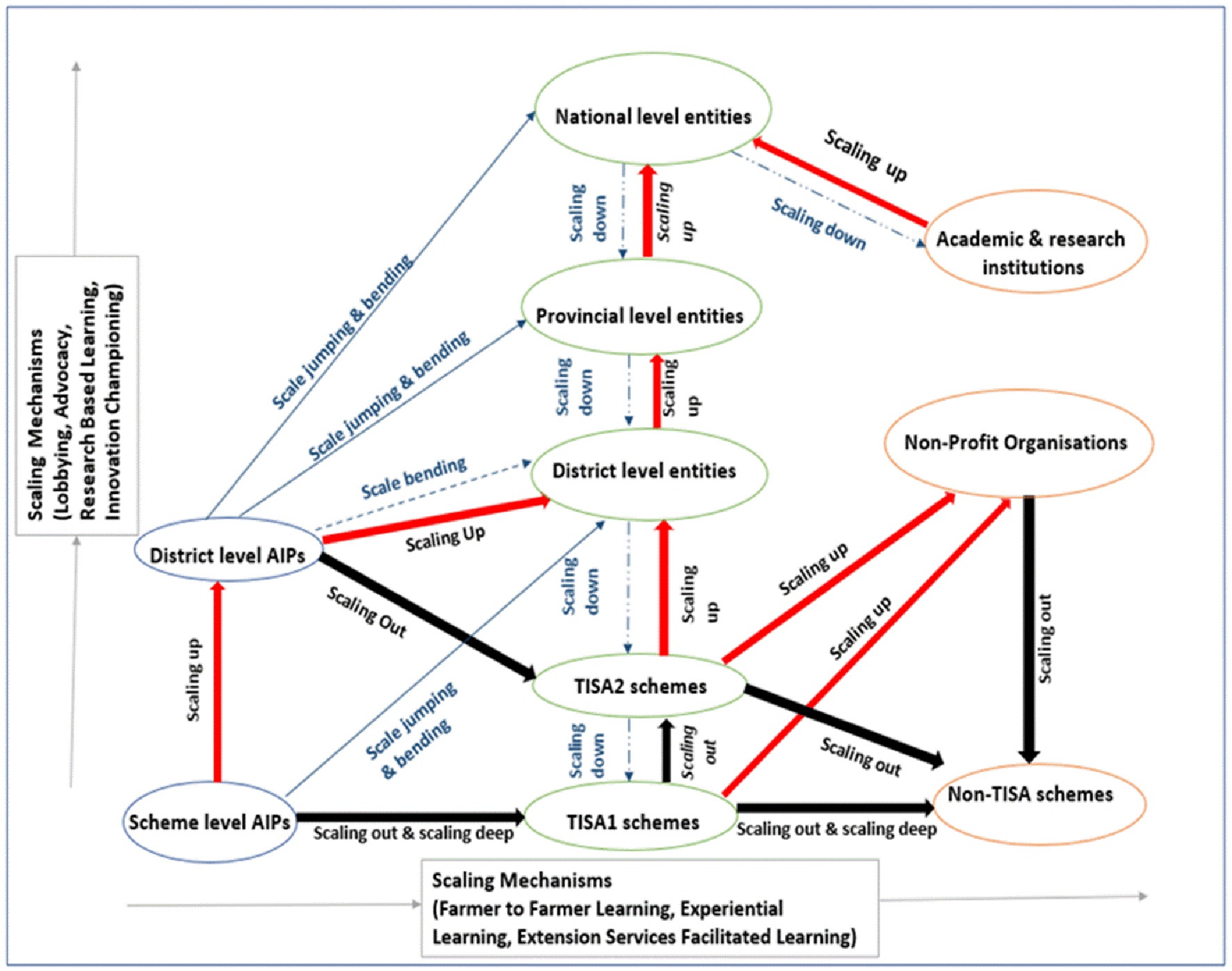 Through an assessment of TISA project reports and conducting semi-structured interviews with irrigation scheme members, key stakeholders at district, provincial and national level, the study found that different dimensions, strategies and mechanisms were utilised at different levels to scale agricultural innovations. The study also found that AIPs were established at scheme and district level within the targeted areas creating new social networks which are an amalgamation of the networks that the individual actors within the AIPs bring from outside the forum. These networks were key in fulfilling the function of scaling agricultural innovations outside the AIP domains.
