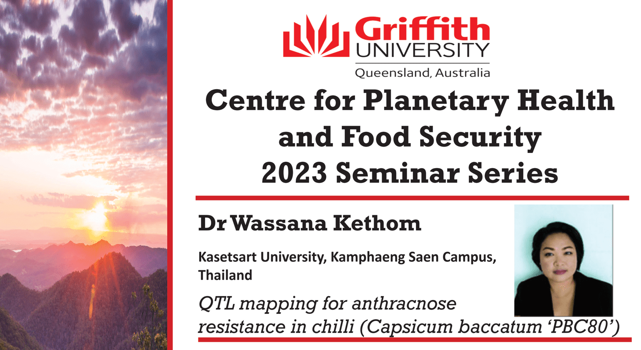 While in Australia, Dr Kethom presented a special seminar about the research project titled, “QTL Mapping for anthracnose resistance in Chili (Capsicum baccatum ‘PBC80’) at Griffith University’s Nathan Campus in Brisbane, and online via Teams organised by the Centre for Planetary Health and Food Security.