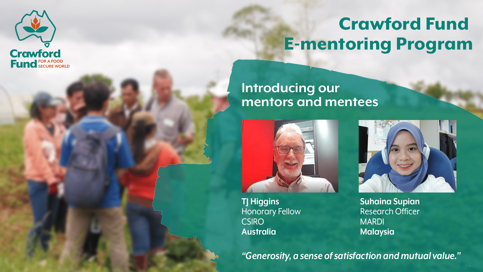 Our latest e-mentoring pair reflecting on their experience are TJ Higgins, Honorary Fellow, CSIRO and his e-mentee Suhaina Supian, a Research Officer at the Malaysian Agricultural Research and Development Institute (MARDI) in Malaysia.