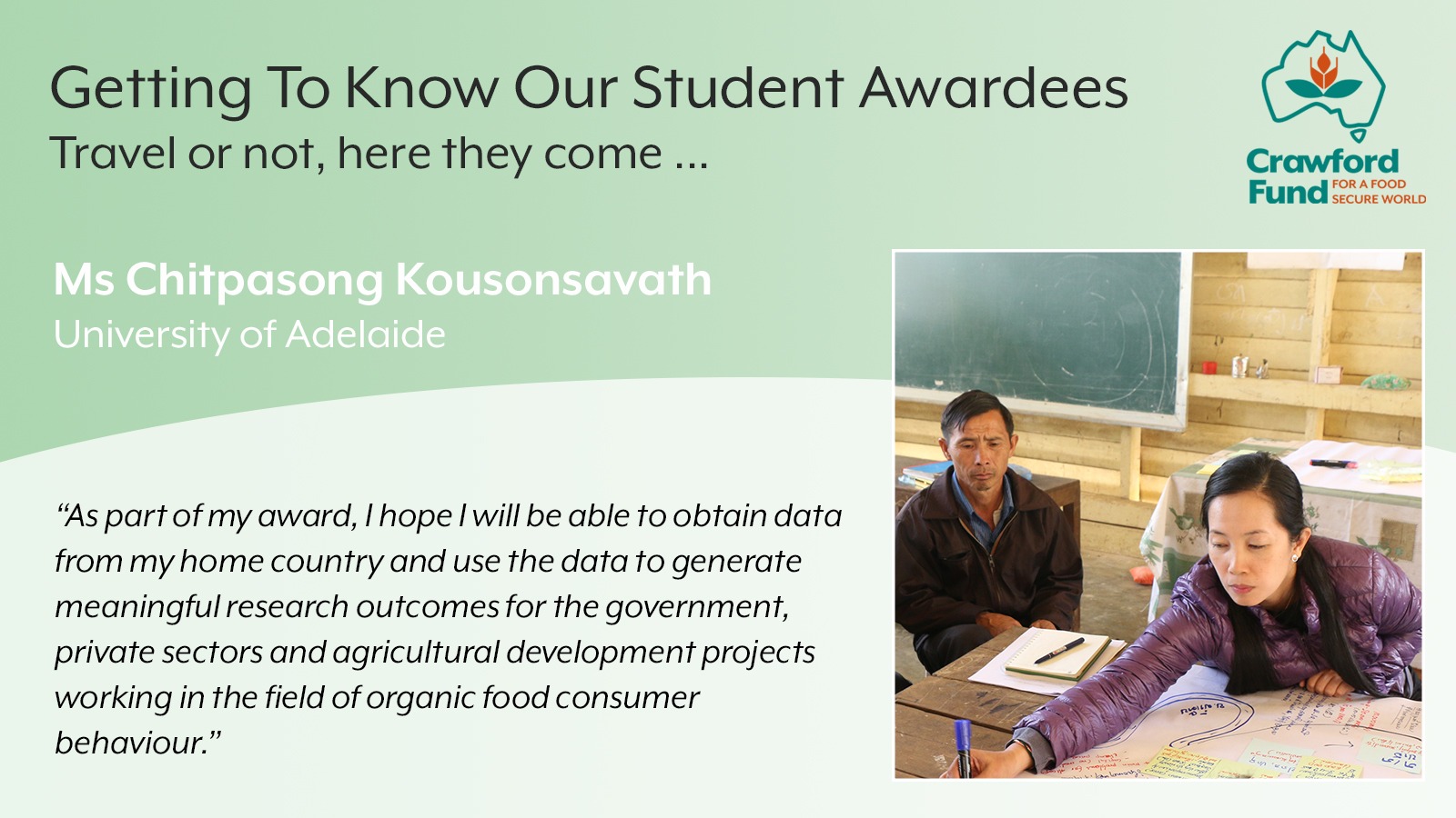As part of my award, I hope I will be able to collect consumer data from my home country (Laos) and use the data to generate meaningful insights on organic food purchasing and consumption behaviour, of use to the government, private sector and agricultural development projects—all of whom are investing in the development of an organic industry and certification system in Laos.