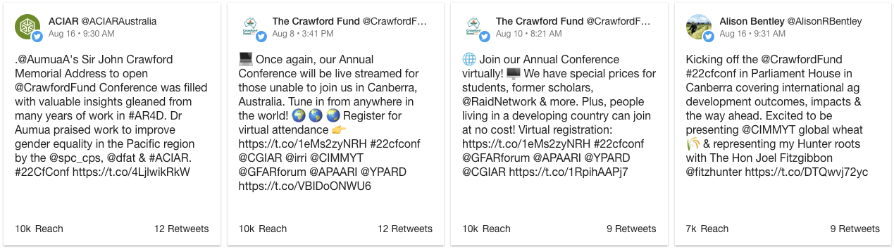 In addition, there was significant engagement through our social media outreach with stakeholders and sponsors making good use of our social media kit for the event. A social media report tracking the conference hashtag #22cfconf shows it attracted 12.1m impressions in the two months around the conference, peaking at around 5m on the conference days, with almost 1000 tweets. While most of the engagement was in Australia, it was great to see the hashtag was also used around the world – the magic of social media!