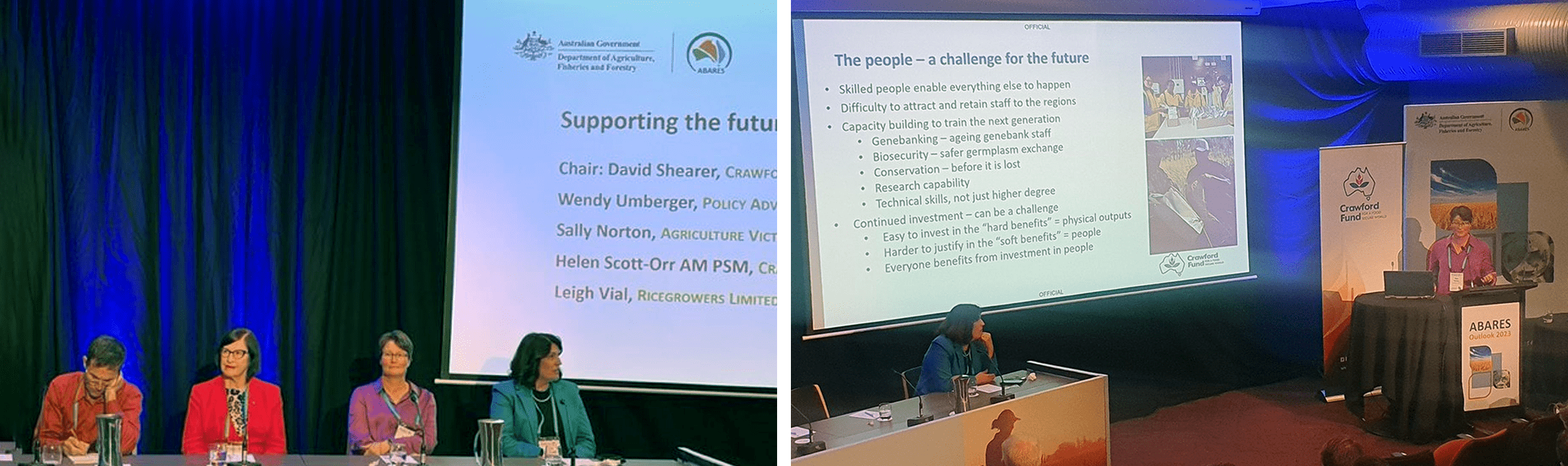 The overview speaker was Dr Wendy Umberger, Chair, ACIAR Policy Advisory Council and member of the Crawford Fund SA Committee, former President of AARES. She was followed by three speakers presenting on lasting impacts around significant issues in Australian and regional agriculture including Dr Sally Norton, National Leader, Australian Grains Genebank who talked about Germplasm Conservation, Exchange and Use; Dr Helen Scott-Orr, Crawford Fund NSW Coordinator and inaugural Inspector-General of Biosecurity who focused on Biosecurity; and Dr Leigh Vial, Board Member, Sunrice Australia, ACIAR Project Leader and farmer who presented about Private Sector Involvement.