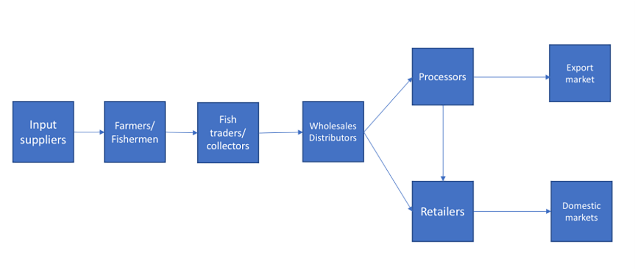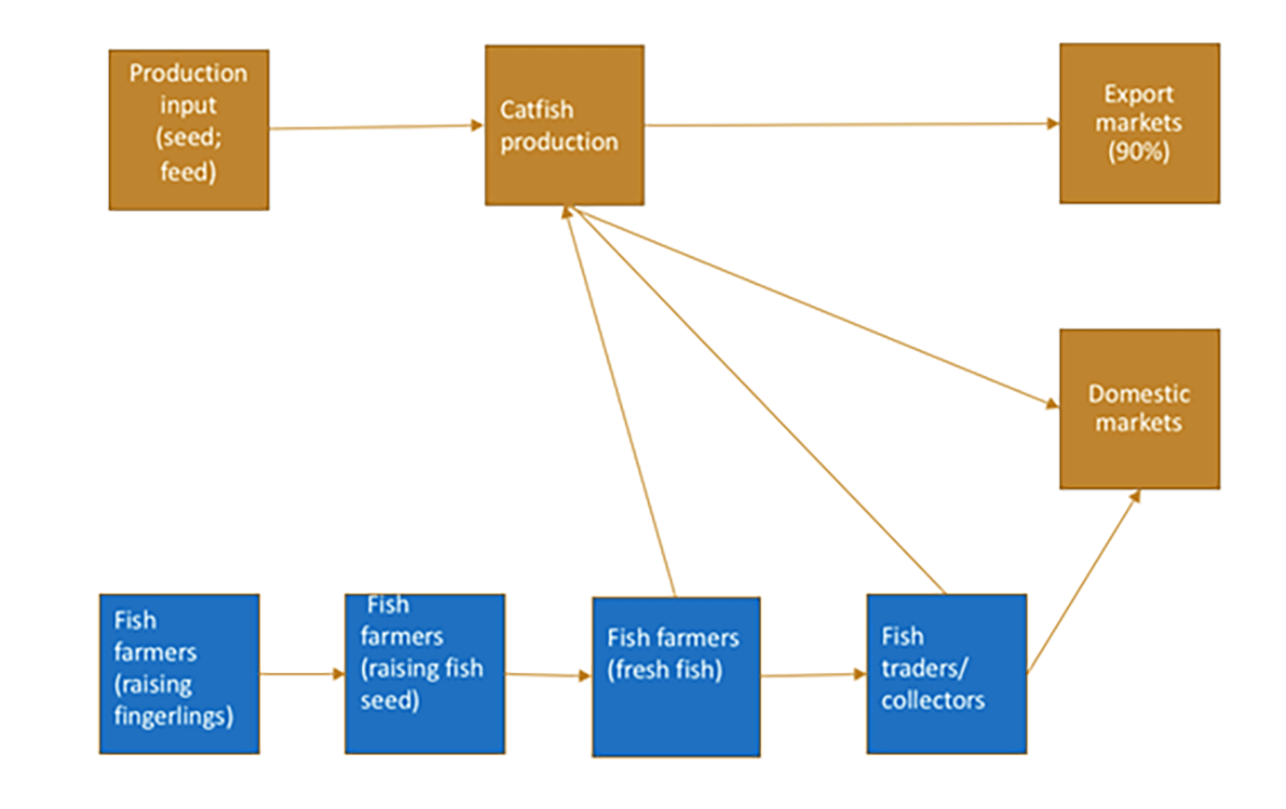 In Vietnam, she identified two main value chains. Companies highlighted in brown in Fig. 3 below can manage the entire value chain or collect from local farmers. In contrast, the local fish farmer value chain, shown in blue, is longer and depends on the stage of raising fish until they are sold.