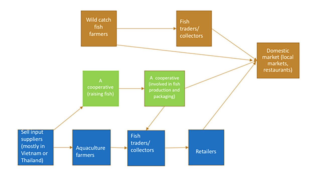 Based on her field work, Yen modified this representation to describe separate value chains in each of Laos and Vietnam. In Laos, she identified three types of freshwater fisheries value chains: wild-caught fish (yellow), small aquaculture farms (blue), and cooperatives (green), as shown in Figure 2.