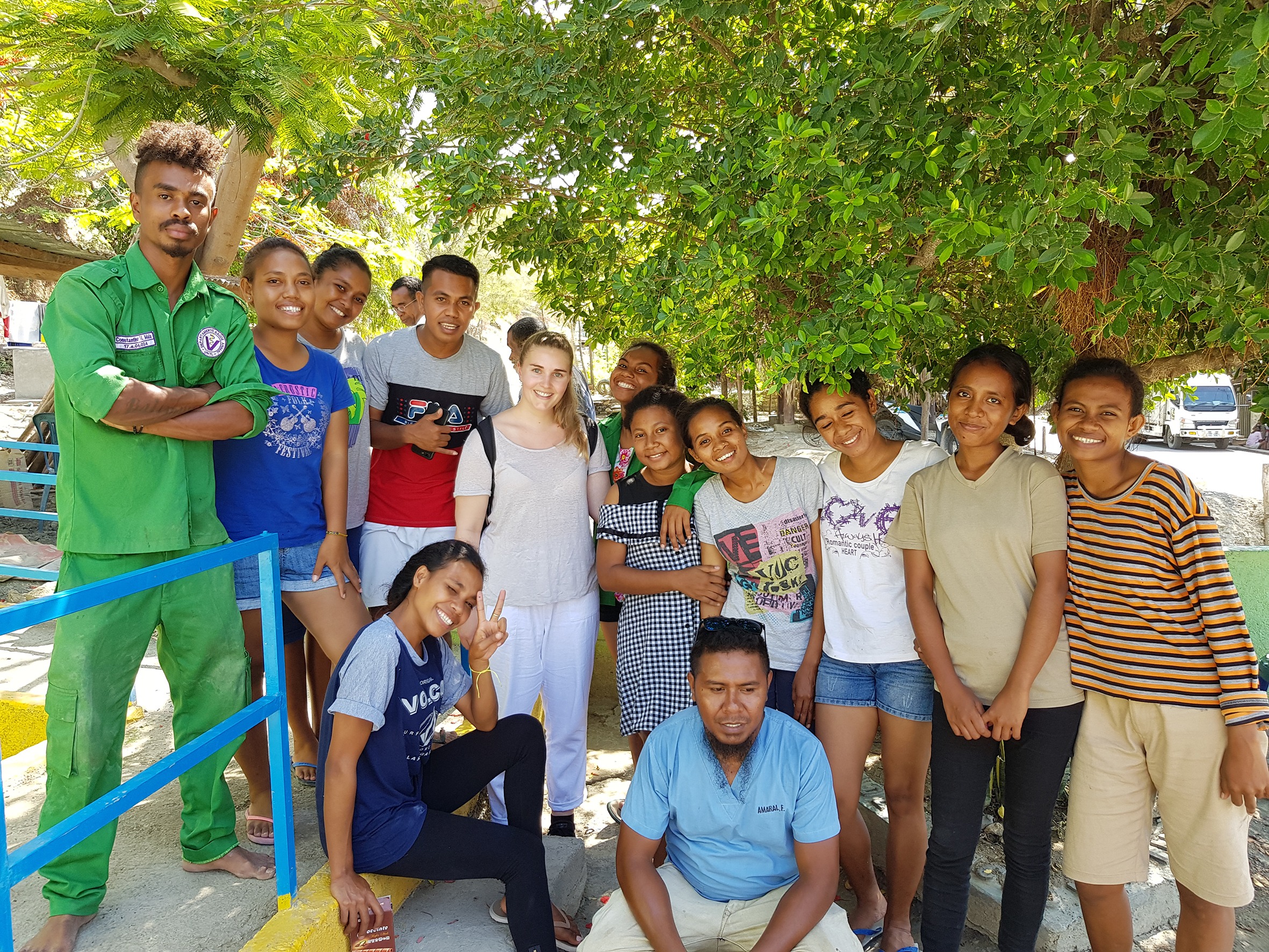 Anna Mackintosh with the next generation of farmers during a field trip to Viqueque in Timor-Leste