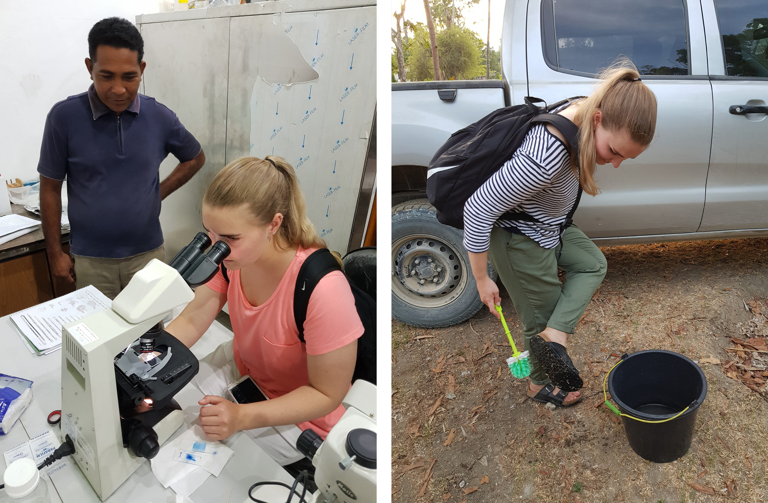 Guilherrimo Soares introduces Anna to invasive nematodes impacting food security in Timor at the National Plant Quarantine (left). Anna Mackintosh, Crawford Fund scholar from UTas, implementing biosecurity measures after visiting a smallholder pig holding (right)