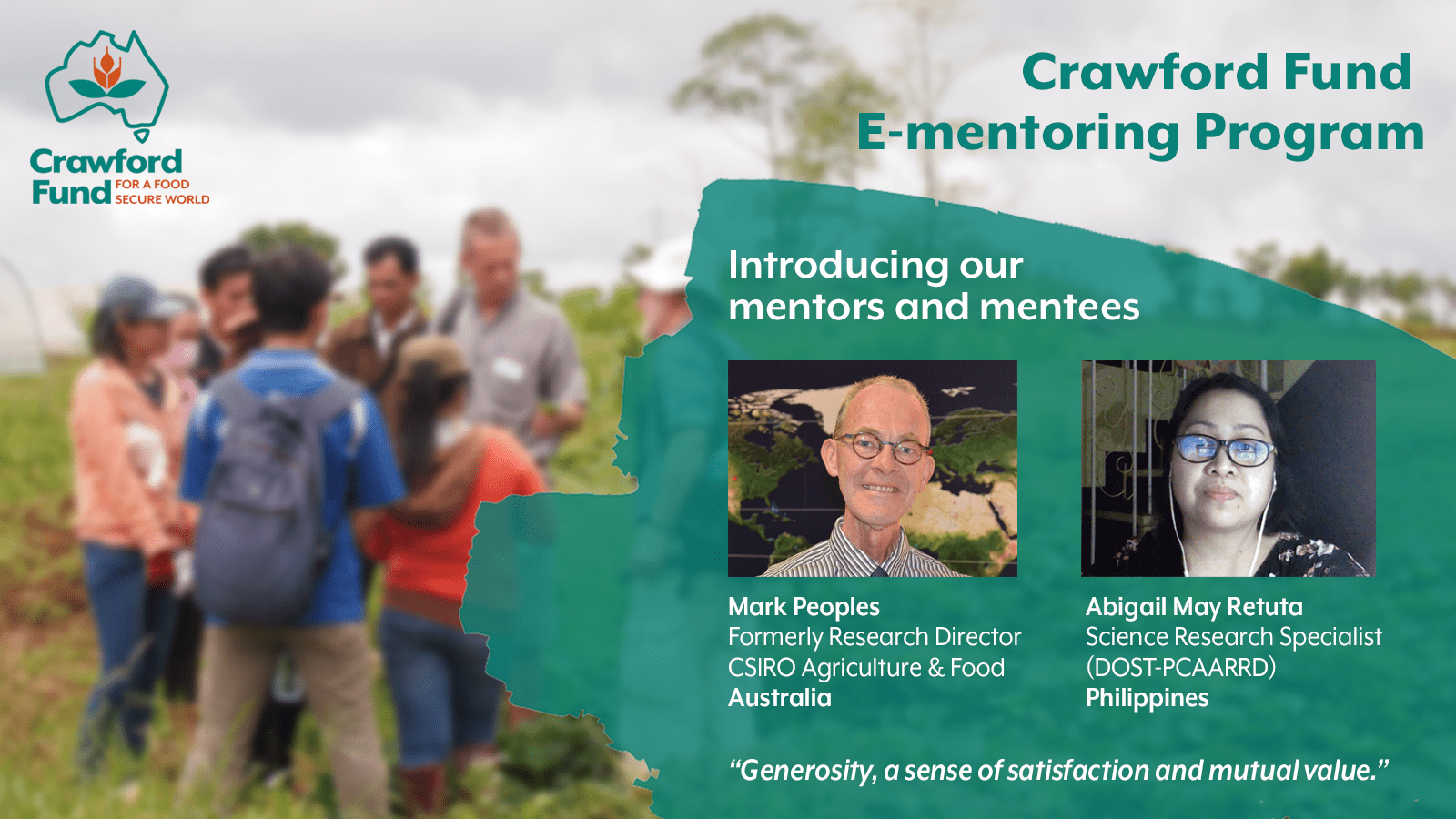We now present our latest e-mentoring pair reflecting on their experience, Mark Peoples, formerly Research Director, CSIRO Agriculture & Food and his e-mentee Abigail May Retuta, a Science Research Specialist, at the Department of Science and Technology, Philippine Council for Agriculture, Aquatic and Natural Resources Research and Development (DOST-PCAARRD).