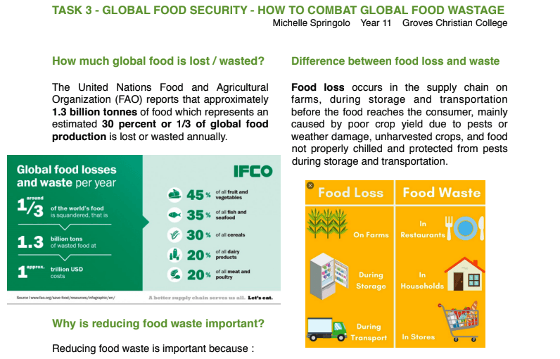 In the years 7-9 category, Thomas, in year 9 at Faith Christian School of Distance Education focused on cool storage transportation systems to combat post-harvest food losses in Africa and runner-up Ruby Linton, year 7 from Home Hill State High School highlighted food wastage statistics via an interesting Infographic.