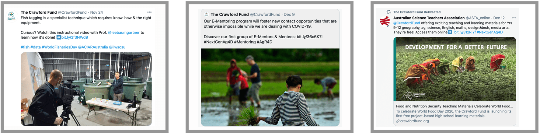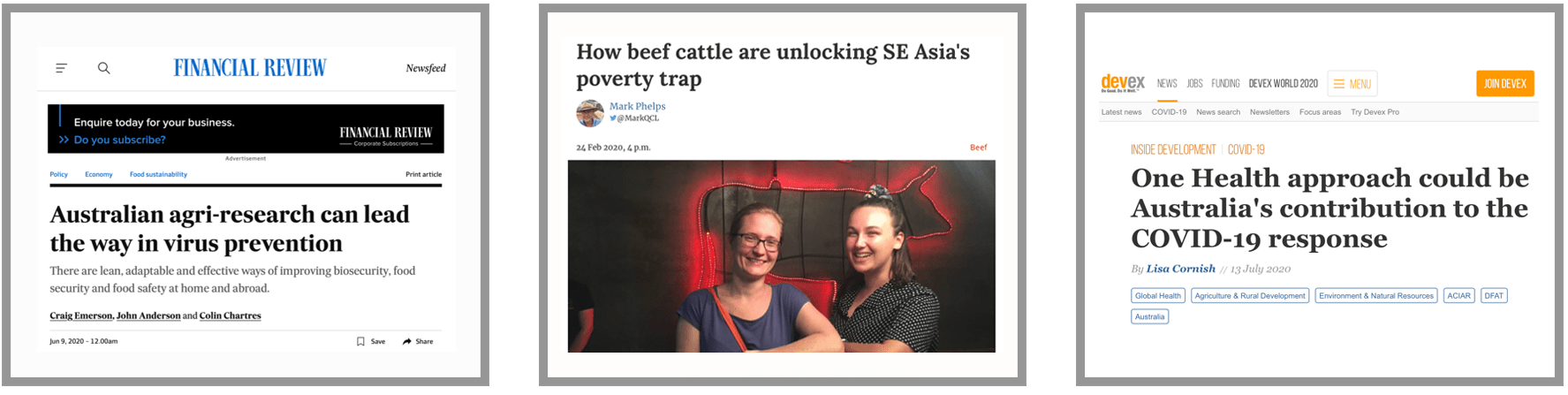 Raising awareness of the benefits to Australia and developing countries from international agricultural research through traditional media was challenging in 2020. Understandably, column inches filled with news of the pandemic as it spread across the globe in the first half of the year. However, we made sure that the impact of the pandemic on food and nutrition security got some attention. We ploughed on and finished the year with a healthy collection of media coverage. Like many individuals and organisations, we were grateful for the greater engagement achieved through our social media channels.