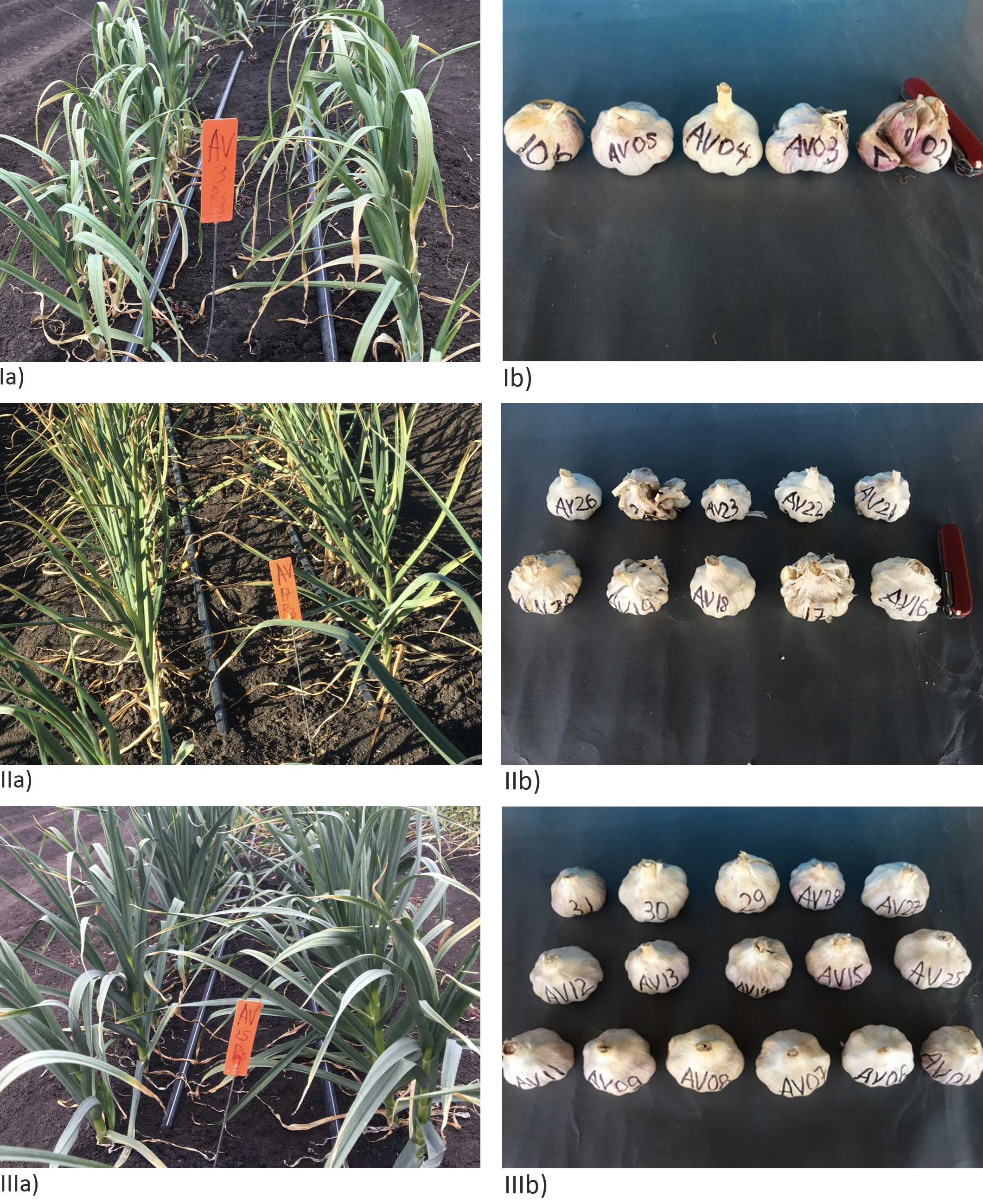 Variability in the morphological characteristics of garlic varieties in Groups I, II and III from a field experiment conducted in 2018. Group I: foliage is green and flaccid (I a), and the bulbs aggregate similar to shallot bulbs (I b). Group II: the foliage is yellowish green, leaf blades thinner and narrower (II a), and the bulbs are loose with silky skins (II b). Group III: the foliage is dark blue-green, leaf blades are thicker and wider (III a), and the bulbs are tight with thicker skins (III b).