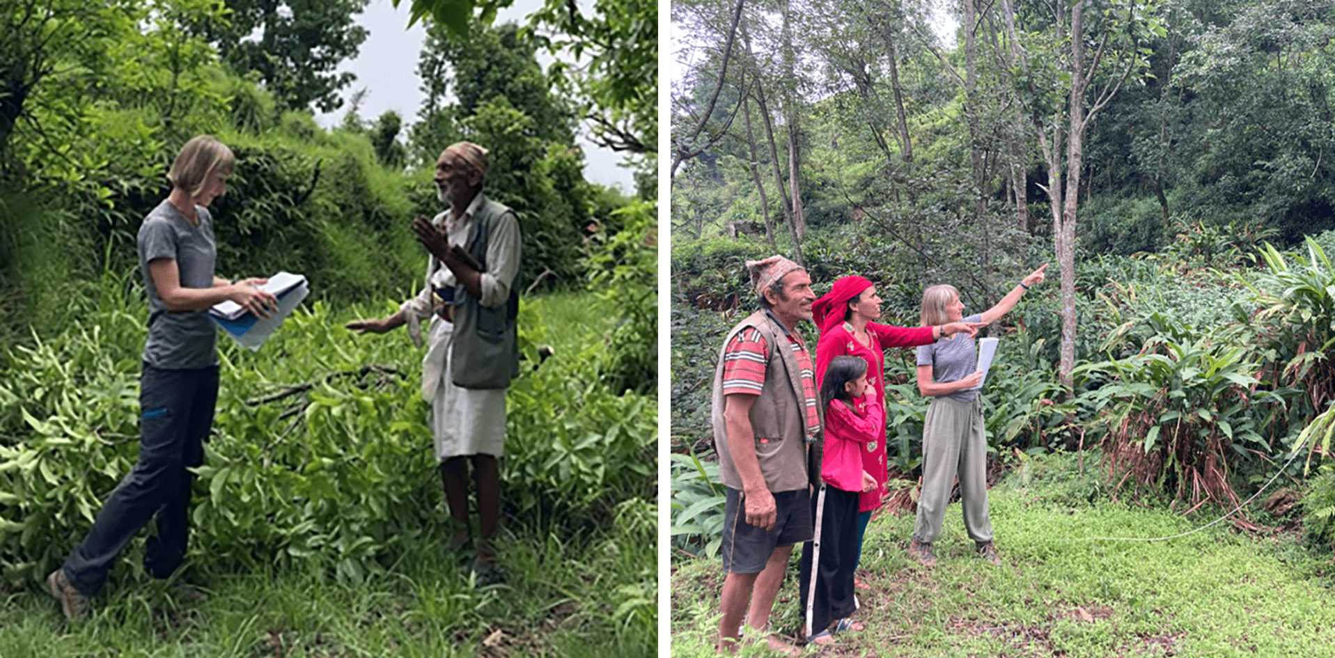 When travel opportunities re-opened, Nicola travelled to Nepal to follow up survey participants in the field. The field work comprised a mixed methods approach: “talk and walk interviews” to assess farmer’s perceived benefits of regenerating species on abandoned agricultural land and to look at what was actually growing on the land.