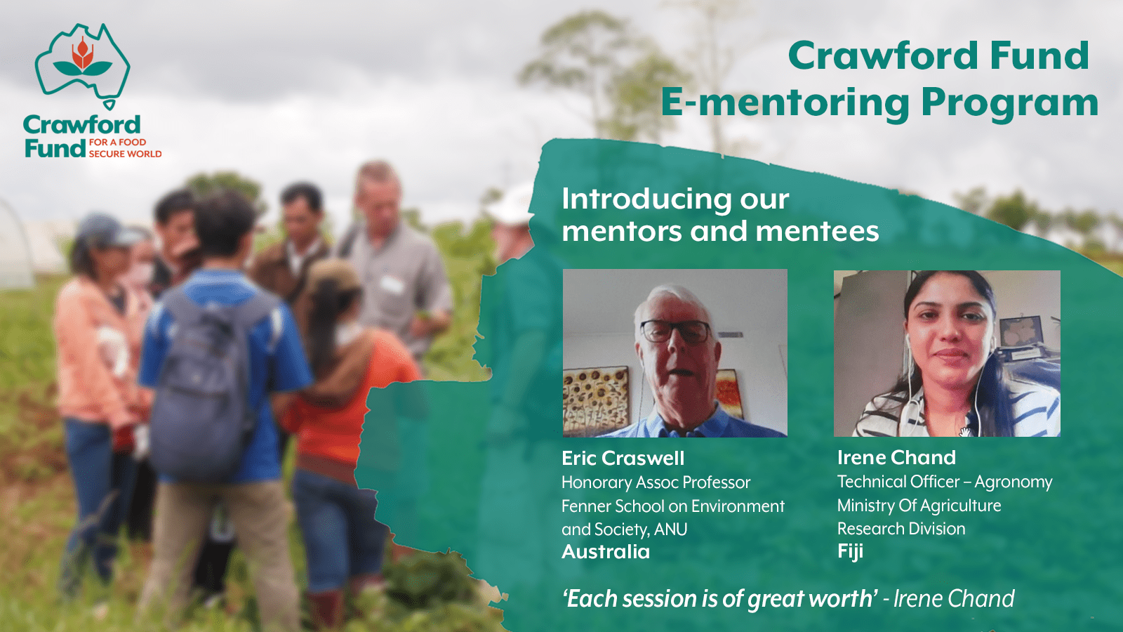 We now present our latest e-mentoring pair reflecting on their experience, Honorary Associate Professor Eric Craswell, Fenner School of Environment and Society at the Australian National University (and the Crawford Fund’s former Director of Training) and his e-mentee Mrs Irene Chand, Technical Officer – Agronomy at the Fiji Ministry of Agriculture – Research Division.