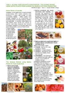 Michelle’s fantastic project titled, Global Food Security Investigation – The science behind using native plants from across the world for food production, provided a very comprehensive analysis of native plants used as food sources globally, their nutritive qualities, and their potential to be further utilised in the face of ongoing climate change challenges.