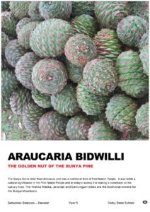 Sebastian’s project featured the Araucaria Bidwilli, the Bunya Pine, and the nut it produces. The Bunya Pine has grown in parts of Australian for millions of years, is culturally significant to our First Nation People, and, was even a food source for dinosaurs! According to Sebastian, the nuts can be milled for flour, and as they are gluten-free they are a fantastic option for people with coeliac disease. Some popular recipes include bunya nut pesto, steamed bunya nut pudding and bunya nut chocolate cake.