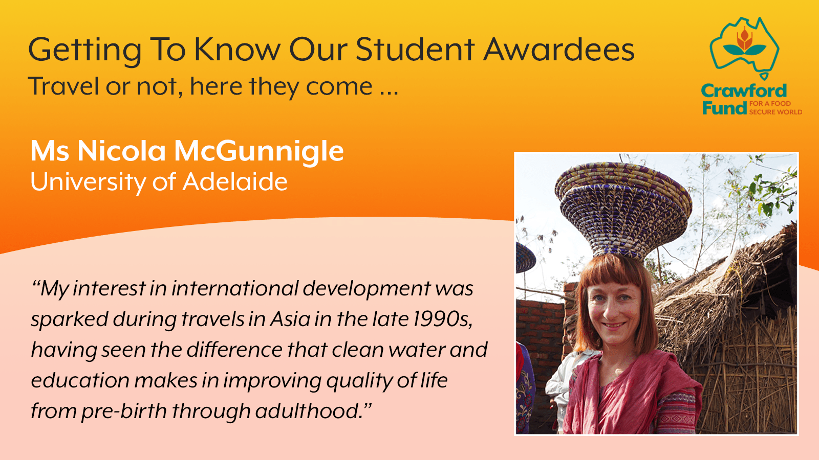 We are excited to now bring you more details of each of our Awardees, their projects, and what they hope to achieve with the opportunity provided by our support. We are pleased to also provide input from our awardees’ supervisors on what they see as the benefit of the opportunity to add an international component to their student’s studies and research.