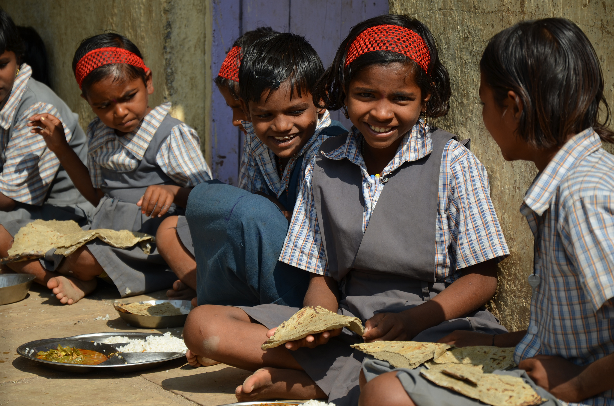 Young school children in rural India eating millet chappatis with rice and vegetable curry. Photo A. Paul-Bossuet, ICRASAT