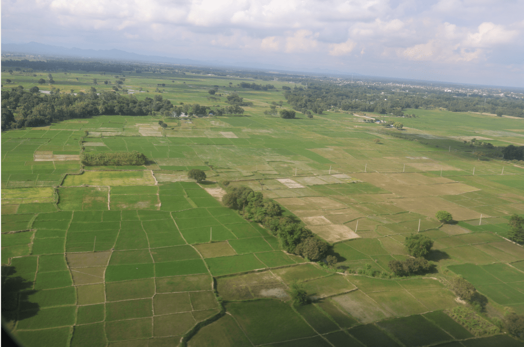 Left: The lush, green farms belie a harsh truth: while 81.05% of households own land, 46.15% own less than 0.5 hectares and 21.54% own between 0.5 to 1 hectare. Right: Manita (centre) with two farmers returning home after irrigating their fields.