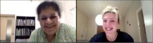 Sophie (right) talking online to Alka Palrecha, a reclaimed water expert about the current practices, challenges, and potential opportunities for using reclaimed water for irrigation in India.