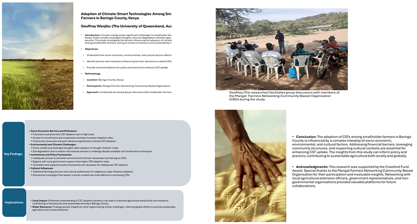Geoffrey also undertook a comparative analysis of CST adoption in Baringo County and technology adoption in Queensland, which revealed key differences and similarities. In Baringo County, small-scale farmers with limited resources focus on CSTs to combat erratic weather and economic instability, facing significant socio-economic and cultural barriers. In contrast, Queensland’s large-scale farming operations emphasise advanced agricultural technologies to improve productivity and efficiency, with better access to resources, information, and training. Despite these differences, both regions emphasise sustainable agricultural practices to ensure long-term productivity and resilience, highlighting the universal importance of effective policy frameworks and institutional support.