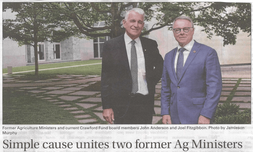Crawford Fund board members John Anderson and Joel Fitzgibbon lobby for international agriculture research